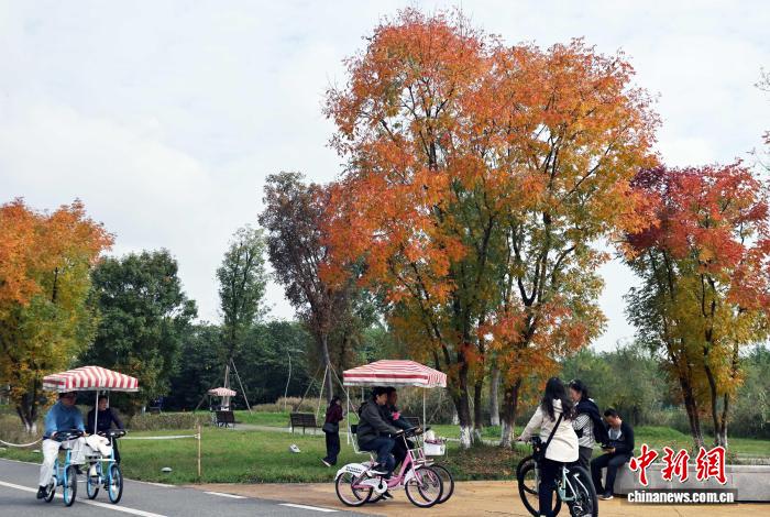 11月8日,4川省成都邑青龙湖干天花园的白枫、梧桐等树木褪来绿衣,换上彩妆吸收市平易近前去赏春。图为市平易近正在青龙湖干天花园骑止赏春。中新社记者 王磊 摄